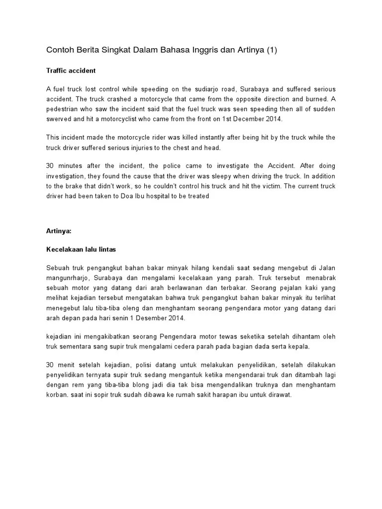 Berikut ini adalah beberapa contoh teks pembawa acara berita dalam bahasa inggris yang bisa dipelajari. Inilah kumpulan contoh berita dalam bahasa inggris dan artinya terbaru. Bukan hanya itu saja contoh berita dalam bahasa inggris juga bisa anda jadikan sebagai referensi untuk membuat teks news item. Contoh news item text dan artinya. A fuel truck lost control while speeding on the mangunraharjo road, .
